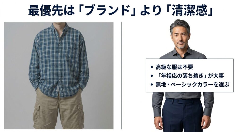 40代のファッションにおいて最も重要なのは、高級なブランドを着ることよりも「清潔感」と「年相応の落ち着き」を手に入れることです。